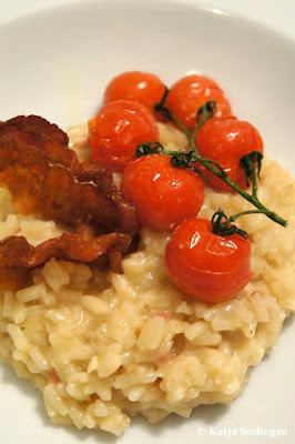 Fill the risotto into a deep plate, place tomatoes and bacon on top and enjoy.